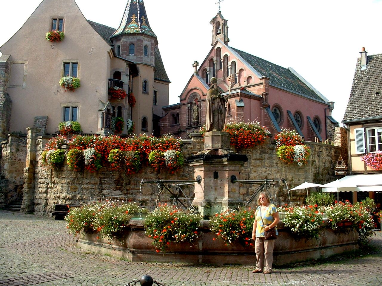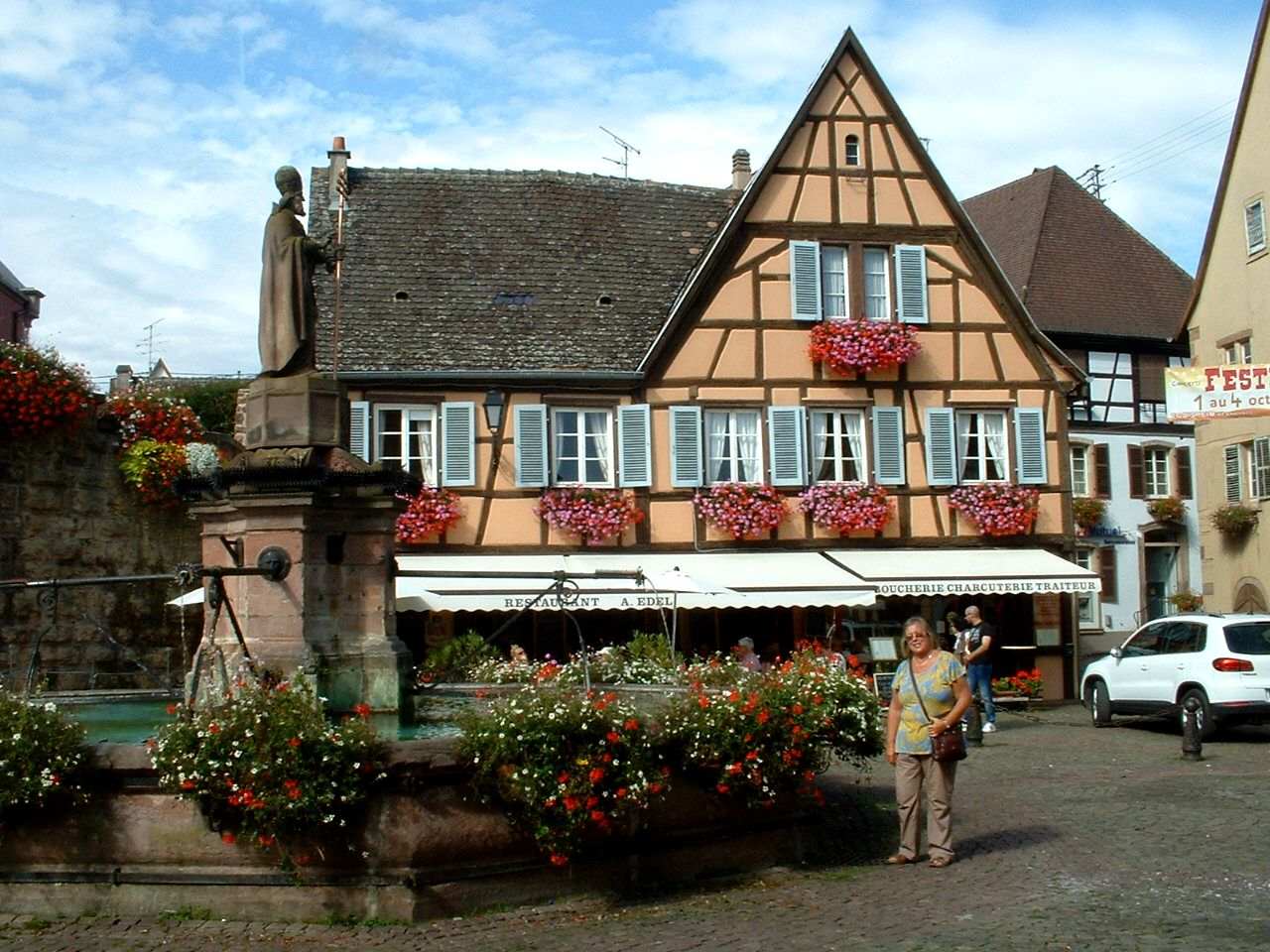This is a festival all about the local food and wines, one we are only too keen to join in with. The central square was packed but we managed to find a table next to the fountain, bought a bottle of the local Pinot Noir and settled down for the afternoon to listen to the music (guitar and synth duo), watch the dancing and soak up the atmosphere. We regretted lunching at the campsite 'cos people were constantly walking past with Alsatian onion tart which smelt delicious but we decided not to be greedy and to save the tarte d'oignion for tomorrow. I made my usual mistake of letting myself get dehydrated (wine ≠ water) and felt a bit ill when we got back to site so spent the evening sipping beakers of water to get things balanced again. |
