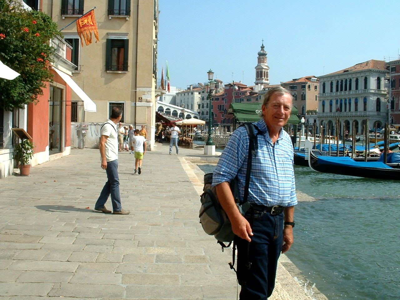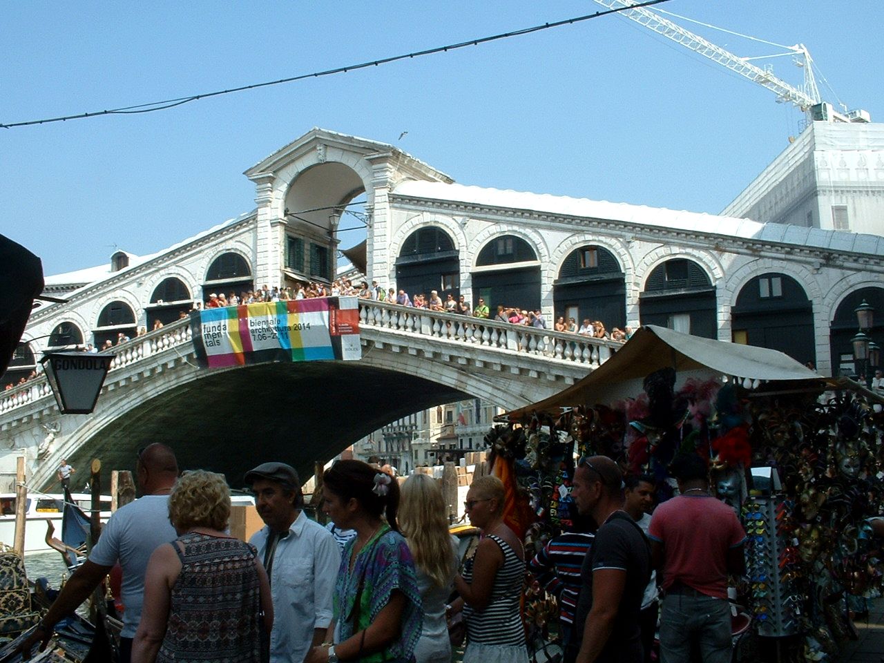 The Rialto bridge above is the oldest crossing the Grand Canal completed in 1591, designed by Antonio da Ponte. It is a fantastic piece of architecture and engineering but attracts so many admirers that it's difficult to move in the crush. Opposite is a view from the bridge showing that the canal is very much a working waterway as well as a tourist trap. The public boats operating on the canal are very efficient and are used by locals as well as tourists but boy are they crowded. Below are a few more pics showing the Rialto area. We did find a nice quiet spot for Sue to take my photo but it was a dead end, you'd have been in the canal if you'd tried to go any further. |
